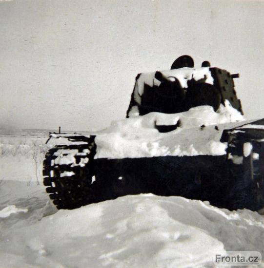 Zima 1941/42, okolí města Jarcevo (Ярцево). Zničený sovětský těžký tank KV-1E s přídavným pancéřováním na věži. V okolí města zůstaly zbytky vojenské techniky po poslední velké obkličovací bitvě na východě – v říjnu 1941 zajaly německé jednotky v prostoru Smolensk – Vjazma cca 300 000 sovětských vojáků.