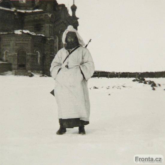 Zima 1941/42, vesnice Uľchovo (Ульхово). Rudolf Gaura na stráži u pravoslavného chrámu sv. Petra a Pavla (Петропавловская церковь) – cca 5 km východně od Jarceva.