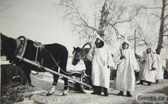 Leden/únor 1942, oblast Děmidov (Дємидов) – Duchovščina (Духовщина). Vojáci se chystají na akci proti partyzánům, na sobě mají improvizované maskovací převlečníky.