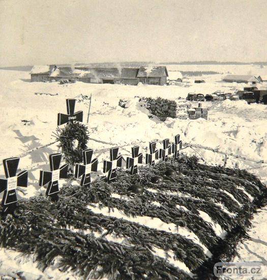 Únor 1942, okolí města Jarcevo. Hroby kamarádů padlých při boji s partyzány od 6. 2. do 12. 2. 1942. V pozadí je patrná uskladněná munice, dále vpravo pak zaparkovaná automobilová technika.