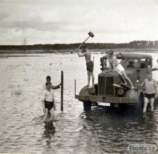 Léto 1942, okolí města Achtyrka. Příslušníci 5. Komp. / 21. Luftnachrichten Regiment při stavbě telegrafního vedení na tahači (Schnell Transporter) Hanomag SS 100.