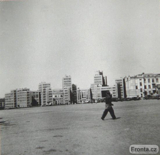 Léto 1942, Charkov. Pohled na Dzeržinské náměstí (Площадь Дзержинского), v pozadí budovy GOSPROM (Дом Государственной промышленности), zbudované v letech 1926-28.