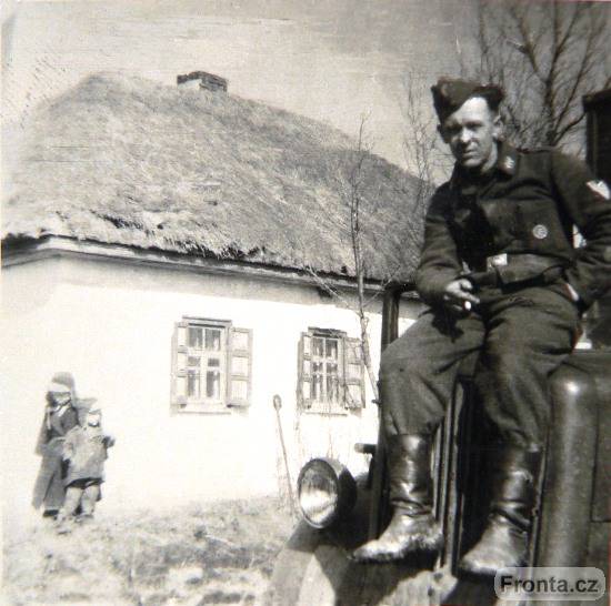 Podzim 1942, okolí města Kirovograd. Desátník (Obergefreiter) Rudolf Gaura v ukrajincké vesnici. Na levém předloktí je částečně viditelný odznak pro řidiče (Kraftfahrer).