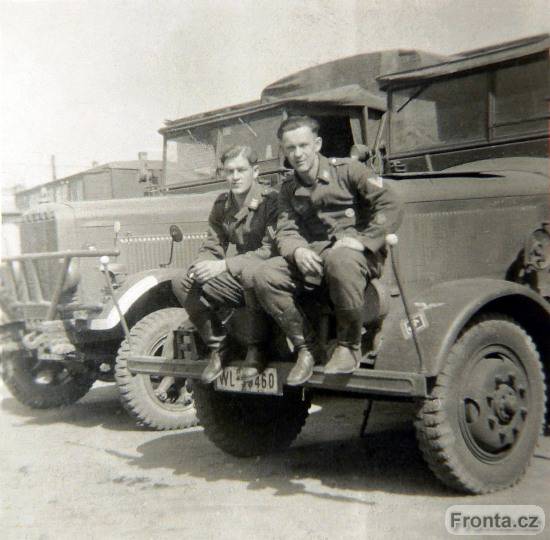 Jaro 1943, Kirovograd. Desátník (Obergefreiter) Rudolf Gaura u nákladního automobilu neznámé značky, na levém předloktí je viditelný odznak pro řidiče (Kraftfahrer). V pozadí nákladní automobil Henschel 33.