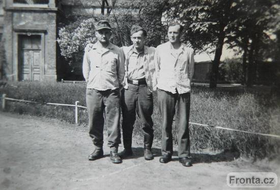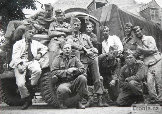 Léto 1946, Lipník nad Bečvou. Rudolf Gaura (první zleva) sedí na nárazníku nákladního automobilu.