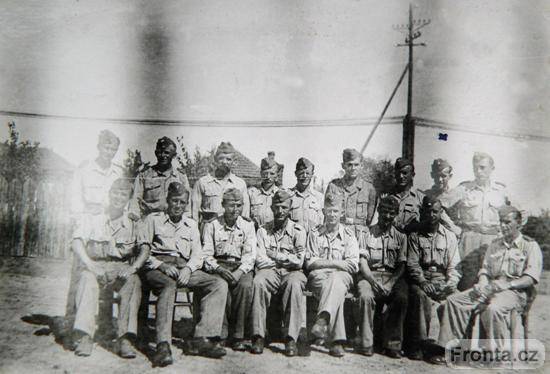 Červen 1944, Buzău. Příslušníci 5. roty / Luftnachrichten Regiment 21. Vojáci mají na sobě letní uniformy, Rudolf Gaura v druhé řadě druhý zprava (označen křížkem).