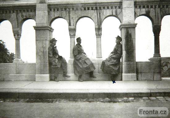 Říjen 1944, Budapešť. Rudolf Gaura (první zprava, označen křížkem) na terase budapešťského zámku (Budavári Palota).