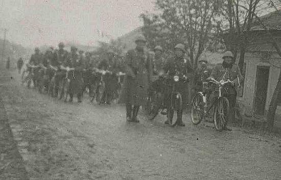Ústup ze státní hranice mezi Výlokem a Fančíkovem na Podkarpatské Rusi 11. listopadu 1938. Vysoký muž v popředí bez kola je inspektor finanční stráže Svoboda