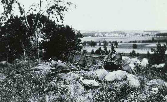 Kolejnicová uzávěra lesní cesty pod horou Hvozd v Lužických horách. Zde bylo bojové stanoviště družstva SOS č. 96 z libereckého praporu Stráže obrany státu. Kádr tohoto družstva tvořili zaměstnanci finanční stráže z oddělení v Heřmanicích u Jablonného v Podještědí. Někteří z nich jsou na snímku. Před uzávěrou je vidět vlastenecky pojatá úprava stanoviště družstva. SOSáci z Lužických hor, stejně jako jejich druhové z celé republiky, byli připraveni bojovat za vlast; nebylo jim to však umožněno