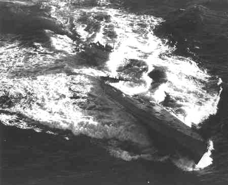 Foto: Potopení ponorky U-185 obdobného typu (IX C 40). Ponorka byla potopena dne 24. srpna 1943 v prostoru jihozápadně od Azorských ostrovů letouny americké doprovodné letadlové lodě USS Core. Ponorku zjistila hlídková Catalina navedená HFDF a přivolala útočné letouny z letadlové lodě.