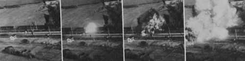 Sekvence záběrů z fotokulometu zachycuje explozi vagonu naloženého municí 6. června 1944 kdesi ve Francii. (Foto: NARA)