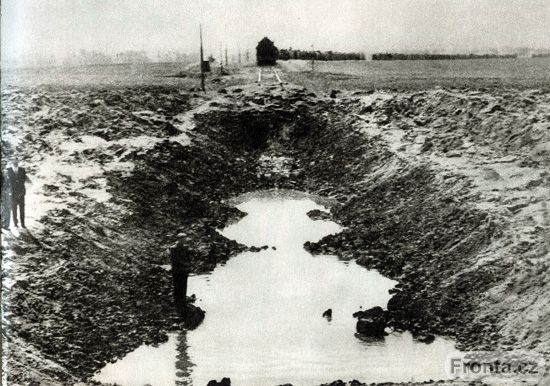 Zničená trať po výbuchu nálože pod muničním vlakem u zastávky Brčekoly 18. dubna 1945