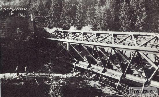 Most na trati Brno - Jihlava u Helenína zřícený po útoku 10. dubna 1945