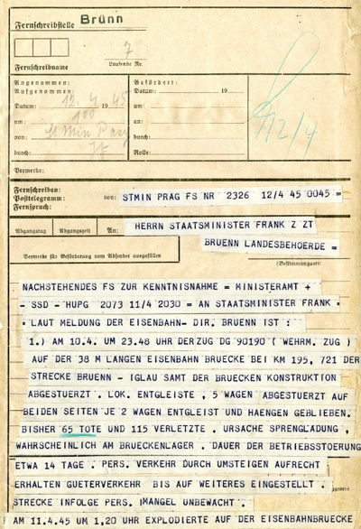 Kvůli nesjízdnosti trati Brno-Jihlava byly vlaky do Jihlavy směrovány přes Tišnov, Nové Město na Moravě, Žďár a Německý Brod. O situaci na Českomoravské vrchovině, kde na jaře 1945 působilo několik partyzánských skupin, je možné si udělat obrázek podle těchto telegrafických záznamů tří stanic: