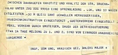 Začlenění protektorátního četnictva k ochraně železnic se projevilo velmi příznivě. V mnoha případech je nyní možno zjišťovat alespoň místo a dobu poškození hadic, protože úředníci četnictva na každém nádraží projevují největší zájem o zjištění, zda tam nedojely již poškozené brzdové hadice. Takovým zjišťováním se cesta mezi místem činu a zjištěním sabotáže podstatně zkracuje.