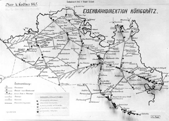 Mapa útoků na železnice v oblasti železničního ředitelství v Hradci Králové