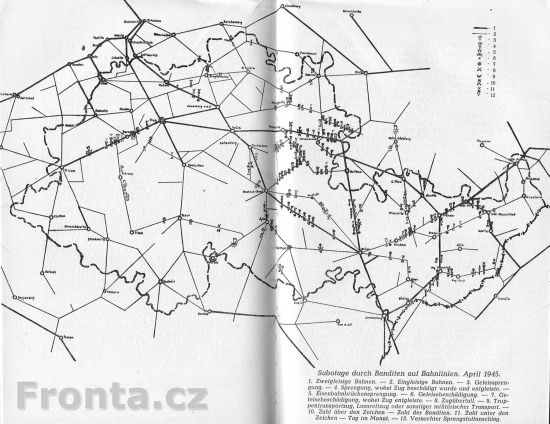 Mapa větších partyzánských útoků na železniční tratě od září 1944 do května 1945