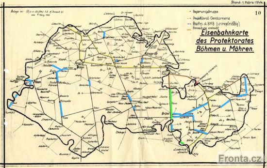 žlutá - vládní vojsko, modrá - Bahnschutz, zelená - protektorátní četnictvo