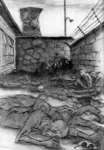 Kresba L.Haase z knihy Svědectví o Mauthausenu 1942 a Dachau 1945. Brno 1946.