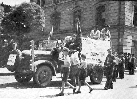 Návrat vězňů z koncentračního tábora (písmena "KLM" na autě značí "Konzentrationslager Mauthausen").